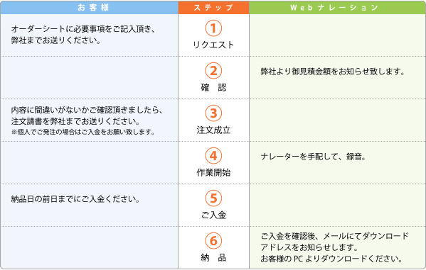 - ナレーター(一人)は弊社にて選定させて頂きます。ナレーターを指定されたい方はお申し出ください。ナレーターリストをお渡しいたします。別途料金 ¥20,000〜/h。